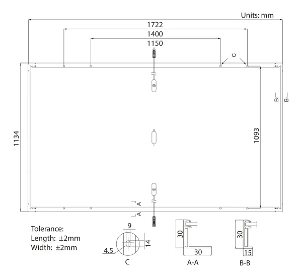 Dimensões do módulo: 1720 x 1134 x 35 mm